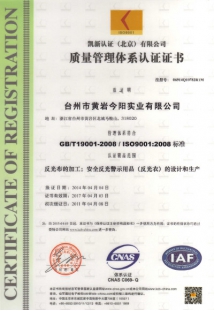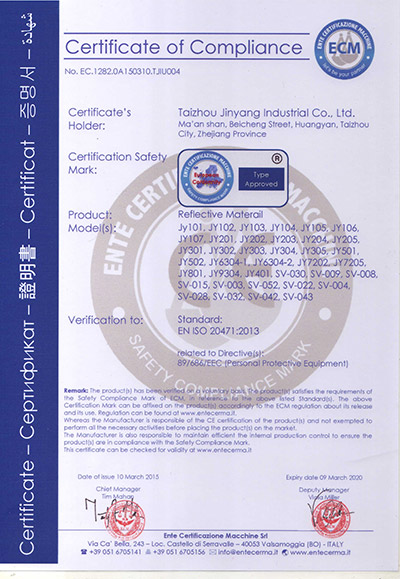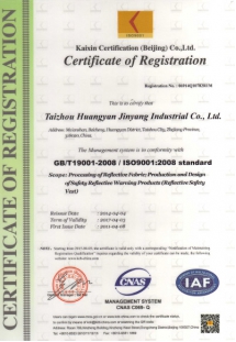 TaiZhou HuangYan JinYang Industrial Co.,ltd is specialized in manufacturing and researching reflective products.Our factory was established in 2001.Our workshop cover 6000m2 with a team of more than 100 workers,Our products have passed the evaluation of ISO9001、EN471 and CE certification.We have our own modern manufacturing facility, we produce our specialized reflective fabric tape , by using high quality materials and effective and efficient technology systems.